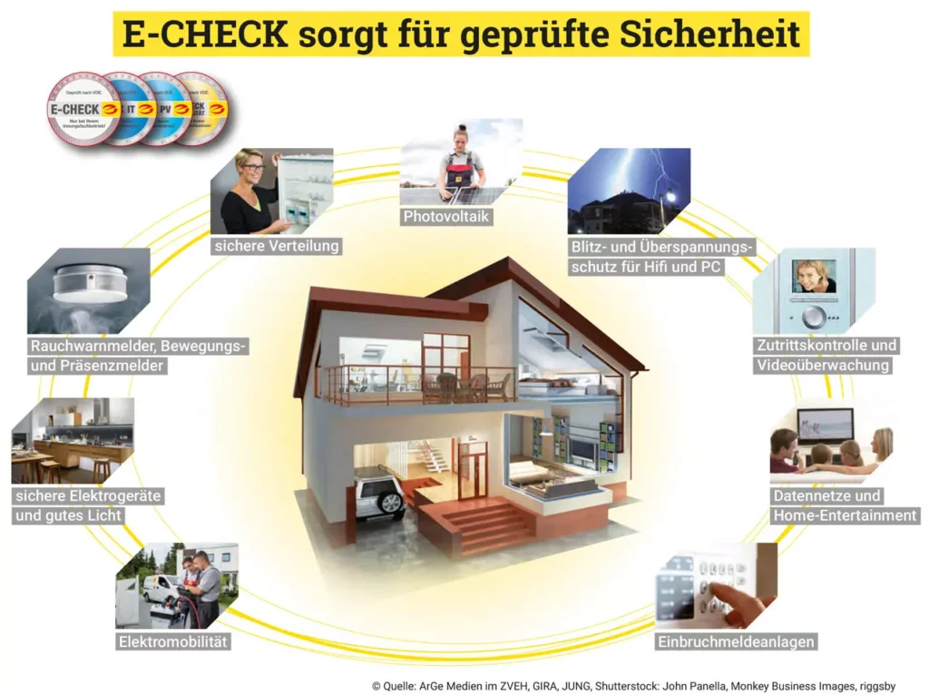 Um Ihre Familie optimal zu schützen und den Wohnbereich bestmöglich abzusichern, gibt es eine anerkannte und normengerechte Prüfung aller elektrischen Anlagen und Geräte im Haus bzw. in der Wohnung: den E-CHECK. Der E-CHECK gibt Ihnen die Gewissheit, dass die geprüfte Elektroinstallation und die geprüften Elektrogeräte allen Sicherheitsaspekten genügen. Damit schützen Sie Ihre Familie. Nach einem festgelegten Prüfkatalog dokumentiert der Fachhandwerker mit dem E-CHECK den ordnungsgemäßen Zustand Ihres Stromkreises