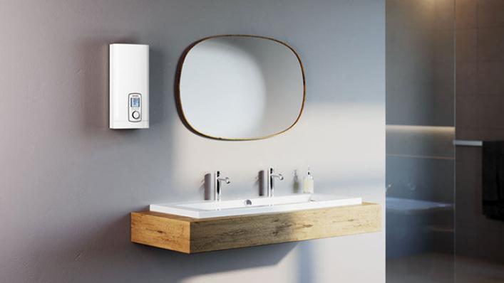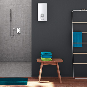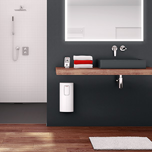 Durchlauferhitzer können mehrere Zapfstellen auch in unterschiedlichen Räumen mit großem Warmwasserbedarf bei hoher Temperatur versorgen, Einsatzbeispiel: Bad und Küche.