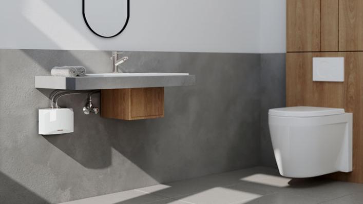 Mini-Durchlauferhitzer versorgen eine Zapfstelle mit geringem Warmwasserbedarf bei mittlerer Temperatur, Einsatzbeispiel: Handwaschbecken.